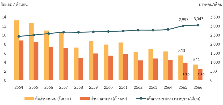 ได้มากขึ้น นอกจากนี้ ในปี 2566 ยังมีกลุ่มคนเกือบจนหรือประชากรกลุ่มที่มีความเสี่ยงสูงที่จะตกอยู่ในภาวะยากจนอีกประมาณ 3.97 ล้านคน รวมทั้ง 2 กลุ่มแล้วจะคิดเป็นประชากรประมาณ 6.36 ล้านคน หรือคิดเป็นร้อยละ 9.08 ของประชากรทั้งหมดในประเทศ