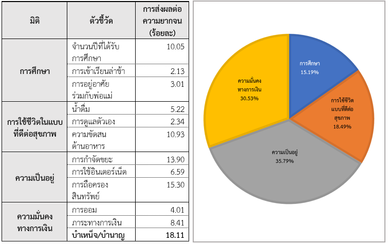 ทั้งนี้ หากพิจารณาในรายมิติแล้วจะพบว่า มิติความเป็นอยู่จะส่งผลต่อความยากจนมากที่สุด คิดเป็น35.79% แต่อย่างไรก็ดี หากพิจารณาให้ลึกถึงรายละเอียดในแต่ละตัวชี้วัดรายมิติแล้วพบว่า ตัวชี้วัดบำเหน็จ/บำนาญของมิติความมั่นคงทางการเงินส่งผลต่อความยากจนมากที่สุดกว่าตัวชี้อื่น ๆ คิดเป็น 18.11%