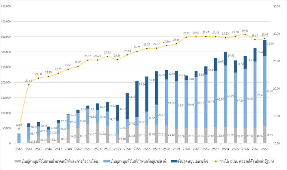 ภาพที่ 7 จำนวนและสัดส่วนเงินอุดหนุนให้แก่ อปท. แยกตามประเภท และสัดส่วนรายได้ อปท. ต่อรายได้สุทธิของรัฐบาล ปีงบประมาณ พ.ศ. 2543 – 2568