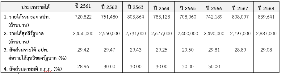 นอกจากนี้ มาตรา 29 วรรคสอง แห่งพระราชบัญญัติวิธีการฯ ได้กำหนดให้การจัดสรรงบประมาณเป็นเงินอุดหนุนสำหรับการดำเนินการโดยทั่วไปของ อปท. ให้ สงป. พิจารณาจัดสรรงบประมาณให้สอดคล้องกับกฎหมายว่าด้วยการกำหนดแผนและขั้นตอนการกระจายอำนาจให้แก่ อปท. ซึ่งพระราชบัญญัติกำหนดแผนฯ ได้กำหนดให้ อปท. มีรายได้คิดเป็นสัดส่วนต่อรายได้สุทธิของรัฐบาลไม่น้อยกว่าร้อยละ 25 และโดยมีจุดมุ่งหมายที่จะให้ อปท. มีรายได้เพิ่มขึ้นคิดเป็นสัดส่วนต่อรายได้สุทธิของรัฐบาลในอัตราไม่น้อยกว่าร้อยละ 35 ดังที่กล่าวไว้ข้างต้น ทำให้ถึงแม้ว่า ก.ก.ถ. จะกำหนดสัดส่วนรายได้ของ อปท. ต่อรายได้สุทธิของรัฐบาลในอัตราร้อยละ 30 ตั้งแต่ปีงบประมาณ พ.ศ. 2562 แต่อำนาจในการกำหนดการจัดสรรเงินอุดหนุนให้แก่ อปท. เป็นของ สงป. และหน่วยงานที่เกี่ยวข้อง ตราบเท่าที่สัดส่วนรายได้ อปท. ต่อรายได้สุทธิของรัฐบาลมากกว่าร้อยละ 25 โดยสัดส่วนรายได้ อปท. ต่อรายได้สุทธิของรัฐบาลตั้งแต่ปีงบประมาณ พ.ศ. 2562 ยังคงอยู่ในระดับที่ต่ำกว่าร้อยละ 30 (ดังตารางที่ 2)