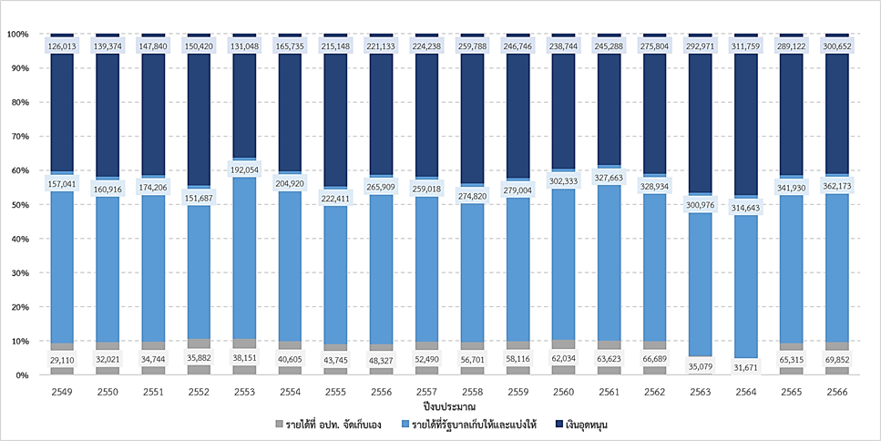จากภาพที่ 1 แสดงโครงสร้างรายได้ อปท. ตั้งแต่ปีงบประมาณ พ.ศ. 2549 – 2566 จะเห็นได้ว่า อปท. พึ่งพารายได้ที่รัฐบาลจัดเก็บให้และแบ่งให้ และเงินอุดหนุนมากกว่าร้อยละ 90 ในช่วงเวลาที่ผ่านมา โดยถึงแม้ว่ารายได้ที่ อปท. จัดเก็บเองในภาพรวมจะมีจำนวนเงินเพิ่มขึ้นต่อเนื่องในทุกปี (ยกเว้นในปีงบประมาณ พ.ศ. 2563 และ 2564 ที่มีการออกมาตรการลดภาษีที่ดินและสิ่งปลูกสร้างเพื่อบรรเทาผลกระทบต่อเศรษฐกิจจากสถานการณ์การแพร่ระบาดของโรคติดเชื้อไวรัสโคโรนา 2019 (COVID-19)) แต่สัดส่วนของรายได้ที่ อปท. จัดเก็บเองเมื่อเทียบกับรายได้ อปท. ทั้งหมดแล้ว ยังคงไม่เกินร้อยละ 10 สอดคล้องกับรายได้จากเงินอุดหนุนที่โดย ส่วนใหญ่มีแนวโน้มเพิ่มสูงขึ้น และคงระดับสัดส่วนรายได้จากเงินอุดหนุนต่อรายได้ อปท. ทั้งหมดไว้มากกว่าร้อยละ 40 ในขณะที่รายได้ที่รัฐบาลเก็บให้และแบ่งให้ อปท. นั้น มีความผันผวนในแต่ละปี ส่วนหนึ่งมาจากสภาวะเศรษฐกิจที่มีการเปลี่ยนแปลงตลอด อย่างไรก็ตาม รายได้ที่รัฐบาลเก็บให้และแบ่งให้ อปท. ถือว่ามีจำนวนและสัดส่วนมากที่สุดในแต่ละปี