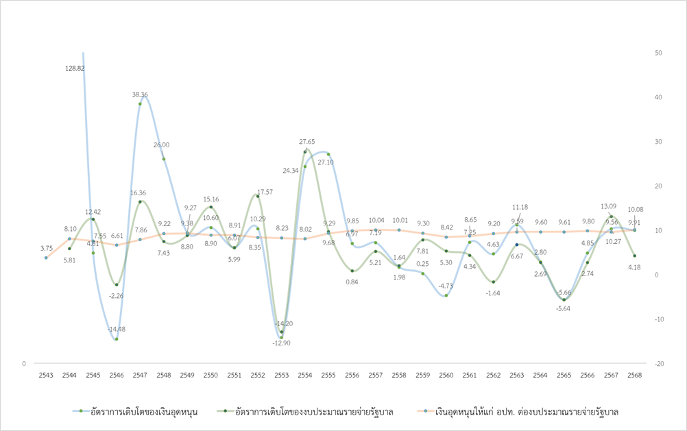 ภาพที่ 4 อัตราการเติบโตของเงินอุดหนุน อัตราการเติบโตของงบประมาณรายจ่ายรัฐบาล และสัดส่วนการจัดสรรเงินอุดหนุนให้แก่ อปท. ต่องบประมาณรายจ่ายรัฐบาล พ.ศ. 2543 – 2568