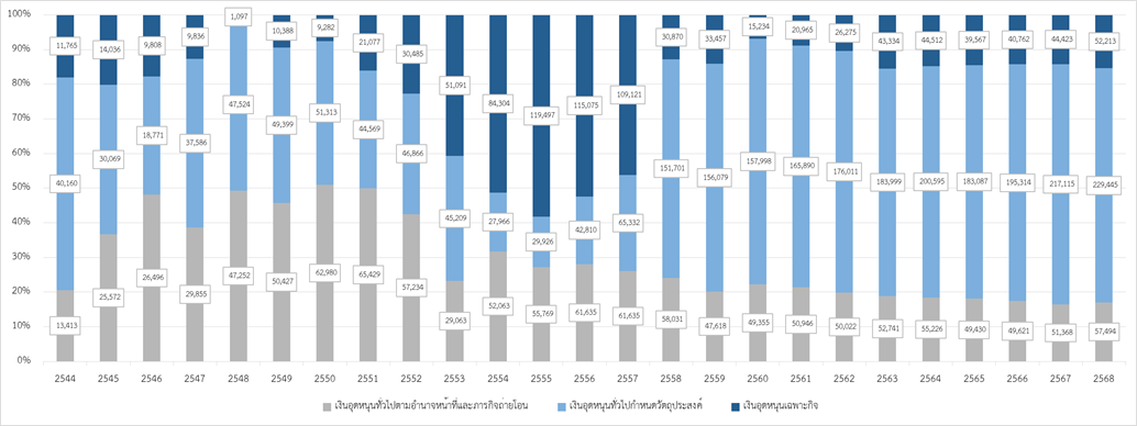 แผนผังเงินอุดหนุนที่จัดสรรให้แก่ อปท. ระหว่างปีงบประมาณ พ.ศ. 2544 – 2568 แสดงให้เห็นถึง การเปลี่ยนแปลงโครงสร้างประเภทของเงินอุดหนุนให้แก่ อปท. ตามนโยบายการกระจายงบประมาณจากรัฐบาลสู่ท้องถิ่น อาทิ ตั้งแต่ปีงบประมาณ พ.ศ. 2551 เป็นต้นมา ได้เปลี่ยนแปลงประเภทของเงินอุดหนุนเหลือเพียง 2 ประเภท ได้แก่ เงินอุดหนุนทั่วไป และเงินอุดหนุนเฉพาะกิจ โดยกำหนดให้รายการส่วนใหญ่ของเงินอุดหนุนทั่วไปกำหนดวัตถุประสงค์อยู่ภายใต้ประเภทเงินอุดหนุนทั่วไป และรายการที่เหลือบางส่วนให้อยู่ภายใต้ประเภทเงินอุดหนุนเฉพาะกิจ และต่อมาได้มีการปรับโครงสร้างประเภทของเงินอุดหนุนอีกครั้งในปีงบประมาณ พ.ศ. 2558 ทำให้จำนวนเงินและสัดส่วนของเงินอุดหนุนทั่วไป (ประกอบด้วยเงินอุดหนุนทั่วไปตามอำนาจหน้าที่และภารกิจถ่ายโอน และเงินอุดหนุนทั่วไปกำหนดวัตถุประสงค์) เพิ่มขึ้นอย่างมาก และลดสัดส่วนของเงินอุดหนุนเฉพาะกิจ นับแต่นั้นเป็นต้นมา