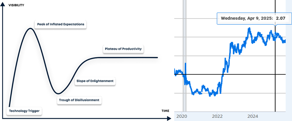 (1) ความผิดหวังจากผลประกอบการ (Earnings Disappointment): นี่คือความเสี่ยงที่สำคัญที่สุด เนื่องจากตลาดในปัจจุบันอยู่ในภาวะ Priced for Perfection ซึ่งหมายความว่าราคาหุ้นสะท้อนความคาดหวังในระดับ สูงสุดต่อศักยภาพของเทคโนโลยีปัญญาประดิษฐ์ (AI) หากการลงทุนมหาศาลในเทคโนโลยีนี้ไม่สามารถแปลง เป็นรายได้และกำไรที่แท้จริงได้อย่างรวดเร็ว หรือองค์กรเริ่มชะลอการใช้จ่ายด้าน AI เนื่องจากไม่เห็น ผลตอบแทนที่คุ้มค่าความเชื่อมั่นของตลาดจะสั่นคลอนอย่างรุนแรงปรากฏการณ์นี้สอดคล้องกับ แนวคิด “Trough of Disillusionment” ซึ่งอธิบายช่วงเวลาที่ตลาดเริ่มหลุดพ้นจากความคาดหวังเกินจริง และเข้าสู่ภาวะ “ความผิดหวังในเทคโนโลยี” (Taherdoost, H., 2025) ความเสี่ยงในลักษณะนี้จึงเปรียบได้กับ “ประกายไฟแรก” ที่สามารถจุดชนวนการปรับฐานของราคาได้อย่างรุนแรง