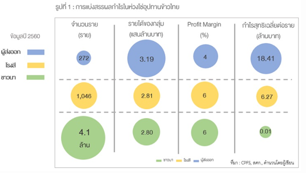 เห็นได้ว่าชาวนาไทยที่เป็นรายย่อยมีกำไรเฉลี่ยต่อปีต่ำมาก เมื่อเทียบกับผู้เล่นรายใหญ่อย่างผู้ส่งออก และโรงสี เนื่องจากมีอำนาจต่อรองต่ำ หากส่งออกหดตัวชาวนาจึงเป็นกลุ่มแรกที่โดนกดราคาขาย และยิ่งหากมีการแข่งขันด้านราคากับอินเดีย และเวียดนาม ยิ่งทำให้ราคาข้าวไทยถูกลงไปอีกทั้งที่มีต้นทุนสูงกว่าคู่แข่ง ซึ่งในตลาดโลกรู้กันดีว่า ข้าวไทยไม่สามารถที่จะใช้ราคาแข่งขันได้อีกต่อไป ขณะที่เวียดนามลดราคาได้มากเพราะส่วนต่างราคาขายและต้นทุน (margin) สูงกว่าไทยมาก ซึ่งต้นตอของปัญหาข้าวไทยเกิดจากปัจจัยด้านอุปทานที่ควรหยิบยกมาแก้ไขอย่างเร่งด่วน